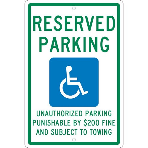 - Specifications: Tennessee State all-purpose aluminum signage is 0.063 in. thick, 12 in. wide and 18 in. high. This rectangular handicap parking sign has green text on a white base. It is graffiti proof and resistant to UV and chemicals