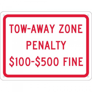 - Clear Visibility: the sign shows the legend “TOW-AWAY ZONE PENALTY $100-$500 FINE” in contrasting colors and clear, bold letters to ensure clear visibility from a distance and in most lighting conditions