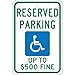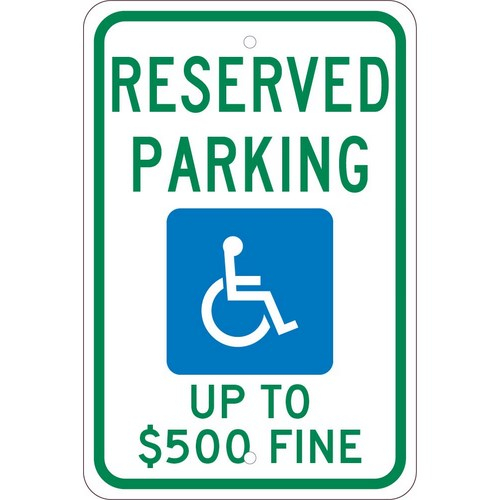 - High Visibility: the sign shows the graphic, and legend “RESERVED PARKING UP TO $500 FINE” in clear, bold letters to ensure maximum visibility. The sign has a wheelchair graphic to reinforce the message