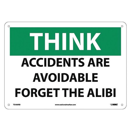 NMC TS100RB OSHA Sign, Legend "THINK - ACCIDENTS ARE AVOIDABLE FORGET THE ALIBI", 14" Length x 10" Height, Rigid Plastic, Black on White