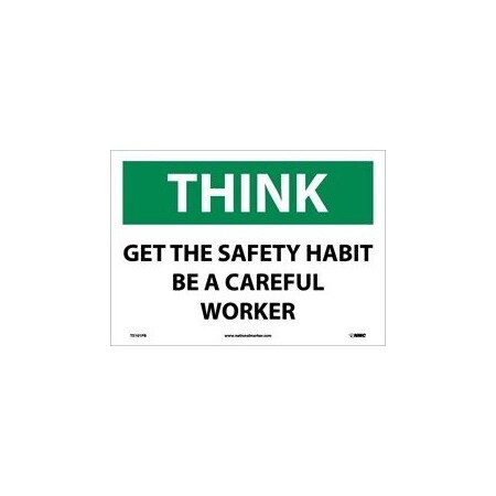NMC TS101PB OSHA Sign, Legend "THINK - GET THE SAFTY HABIT BE A CAREFUL WORKER", 14" Length x 10" Height, Pressure Sensitive Vinyl, Black on White