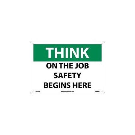 NMC TS106P OSHA Sign, Legend "THINK - ON THE JOB SAFETY BEGINS HERE", 10" Length x 7" Height, Pressure Sensitive Vinyl, Black on White