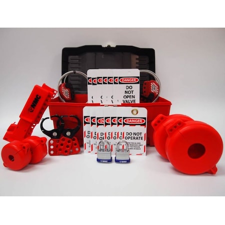 NMC Valve Lockout Kits provide the essentials for any immediate lockout/tagout need. Durable 17" red poly carrying case has items to lockout a variety of gate and ball valves. Includes: (2) 1-1/2" lockout hasps, (2) -3/4" shackle padlocks, (10) lockout tags with fasteners, (10) accidental prevent tags with fasteners, (2) cable lockout devices, (2) valve wheel lockout devices that fit 2-1/25" handles, and (2) ball valve lockouts that fit 1-1/42-1/4" valves.