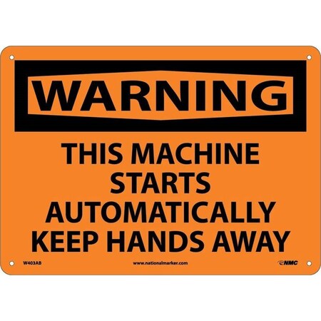 NMC W403P OSHA Sign, Legend "WARNING - THIS MACHINE STARTS AUTOMATICALLY KEEP HANDS AWAY", 10" Length x 7" Height, Pressure Sensitive Vinyl, Black on Orange