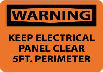 | Feature | Header "WARNING" and legend "KEEP ELECTRICAL PANEL CLEAR 5 FT. PERIMETER" |