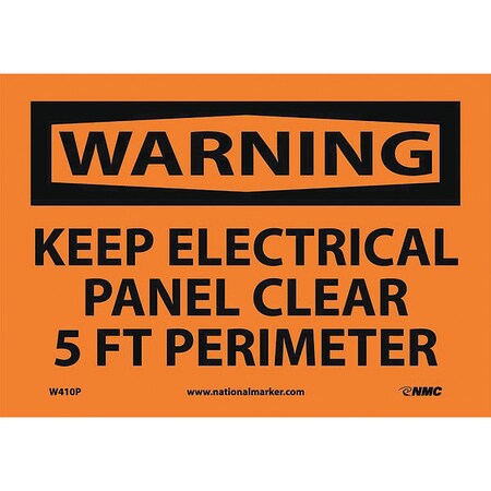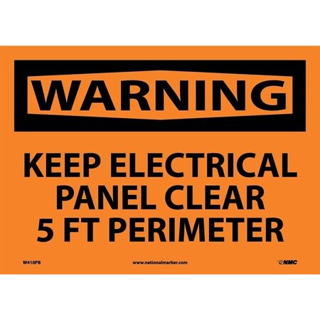 NMC W410P OSHA Sign, Legend "WARNING - KEEP ELECTRICAL PANEL CLEAR 5 FT. PERIMETER", 10" Length x 7" Height, Pressure Sensitive Vinyl, Black on Orange