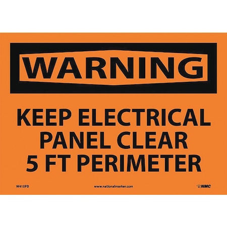 NMC W410PB OSHA Sign, Legend "WARNING - KEEP ELECTRICAL PANEL CLEAR 5 FT. PERIMETER", 14" Length x 10" Height, Pressure Sensitive Vinyl, Black on Orange