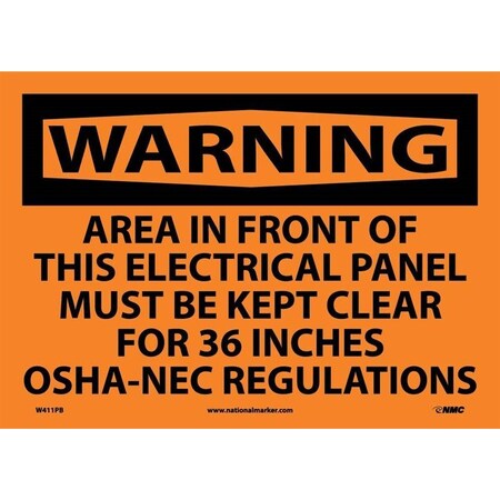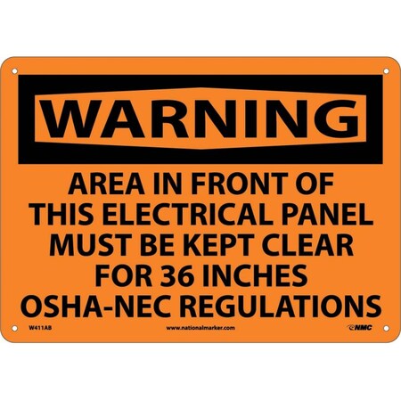 NMC W411AB OSHA Sign, Legend "WARNING - AREA IN FRONT OF THIS ELECTRICAL PANEL MUST BE KEPT CLEAR FOR 36 INCHES OSHA-NEC REGULATIONS", 14" Length x 10" Height, Aluminum, Black on Orange