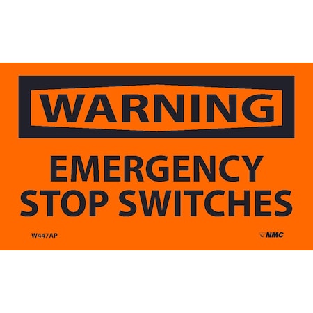 NMC W447AP OSHA Sign, Legend "WARNING - EMERGENCY STOP SWITCHES", 5" Length x 3" Height, Pressure Sensitive Vinyl, Black on Orange (Pack of 5)