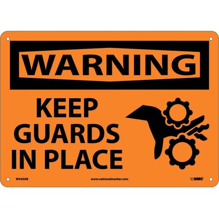 NMC W450AB OSHA Sign, Legend "WARNING - KEEP GUARDS IN PLACE" with Graphic, 14" Length x 10" Height, Aluminum, Black on Orange
