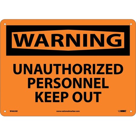 NMC W465AB OSHA Sign, Legend "WARNING - UNAUTHORIZED PERSONNEL KEEP OUT", 14" Length x 10" Height, Aluminum, Black on Orange
