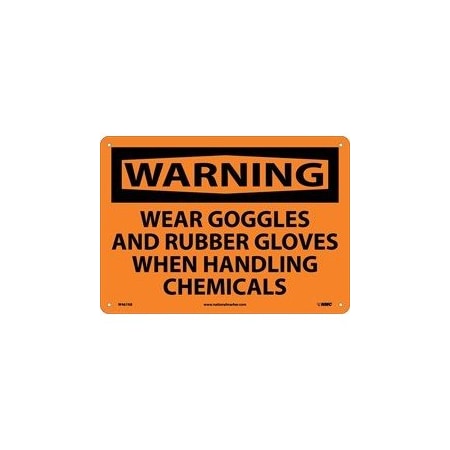 NMC W467RB WARNING – WEAR GOGGLES AND RUBBER GLOVES WHEN HANDLING CHEMICALS Sign - 14 in. x 10 in. Rigid Plastic Lab Warning Signage with Black on Orange