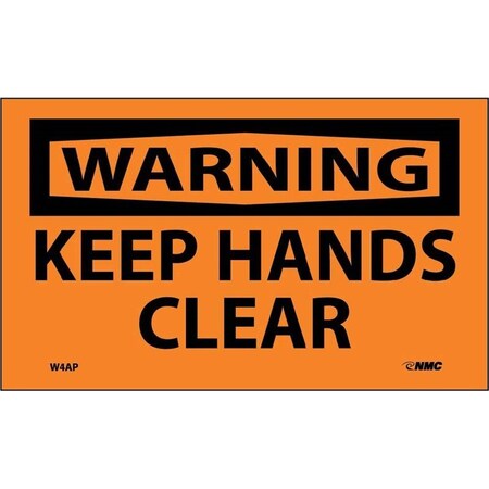NMC W4AP OSHA Sign, Legend "WARNING - KEEP HANDS CLEAR", 5" Length x 3" Height, Pressure Sensitive Vinyl, Black on Orange (Pack of 5)