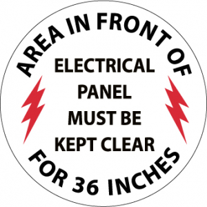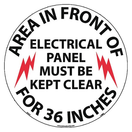 NMC WFS27 AREA IN FRONT OF ELECTRICAL PANEL MUST BE KEPT CLEAR FOR 36 INCHES Walk on Floor Warning Sign – 17 in. Diameter Pressure Sensitive Vinyl Sign with Black/Red on White
