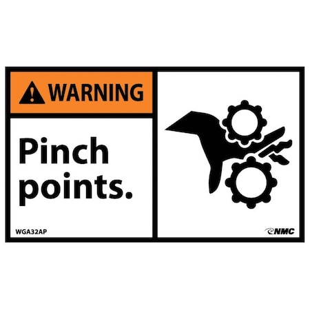 NMC WGA32AP ANSI Sign, Legend "WARNING - Pinch Points.", 5" Length x 3" Height, Pressure Sensitive Vinyl, Orange/Black on White (Pack of 5)