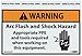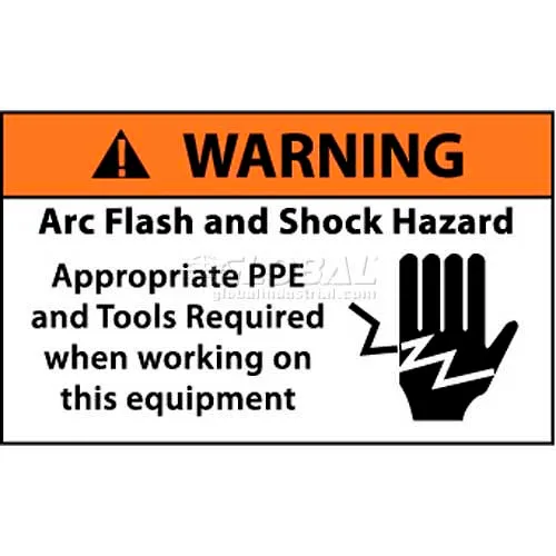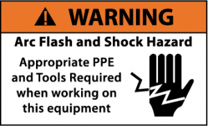 | Feature | Header "WARNING" and legend "Arc Flash and Shock Hazard Appropriate PPE and Tools Required when working on this equipment" |