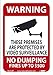 - Visibility: the sign shows the message “WARNING - THESE PREMISES ARE PROTECTED BY VIDEO SURVEILLANCE, NO DUMPING, FINES UP TO 500” in contrasting colors and clear, bold letters to ensure easy visibility