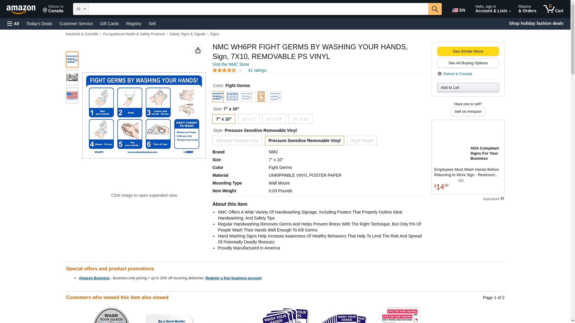 NMC WH6PR FIGHT GERMS BY WASHING YOUR HANDS, Sign, 7X10, REMOVABLE PS VINYL