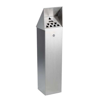 'Cigarette Receptacle, Container Mounting Style Free-Standing, Color Silver, Shape Square, Height 35 In., Material Stainless Steel, Container Strength Medium Duty, Capacity 1-3/4 gal., Container Depth 8 In., Width 8 In., Finish Stainless Steel, Opening Size 1-1/4 In., Top Design Canopy, Number of Openings 8, Includes Inner Smoke Baffle, Four Pre-Drilled Holes, Keyed Lock, Place to Stub out Cigarettes on Top'