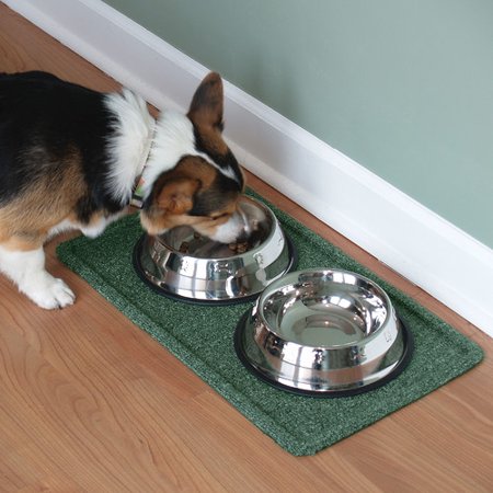 | Feature | "Doggie butler serves as the perfect mealtime tray for man's best friend; great for use under bowls or stands, the absorbent carpet surface sucks up water from spills" |