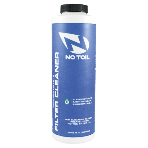 No-Toil cleaner is not a harsh solvent and is completely biodegradable. Cleans filters treated with No Toil original and Evolution filter oil and removes tackiness and dirt in seconds. No-Toil cleaner will only work with No-Toil filter oil. No-Toil cleaner will only work with No-Toil filter oil.