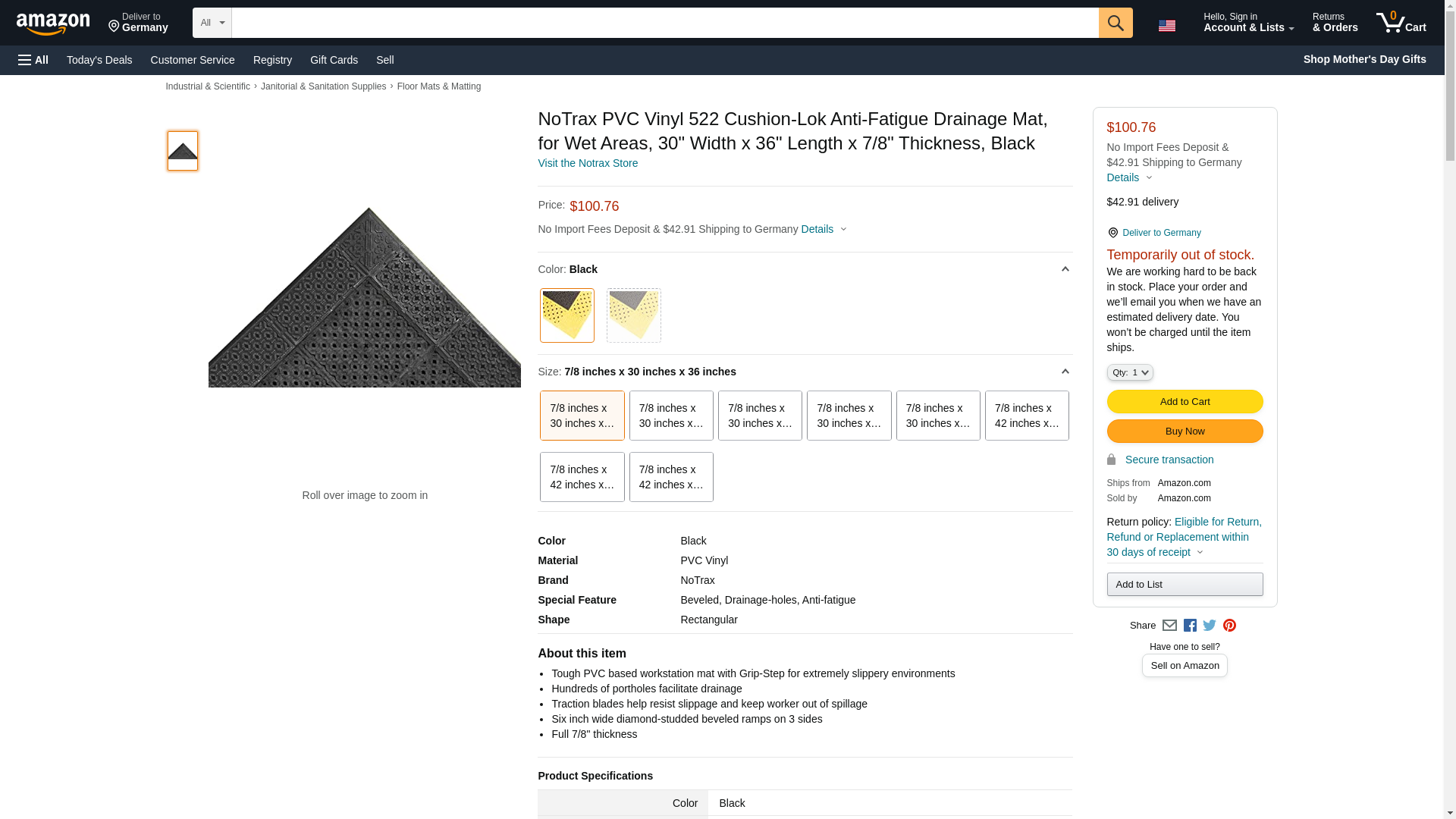 NoTrax PVC Vinyl 522 Cushion-Lok Anti-Fatigue Drainage Mat, for Wet Areas, 30" Width x 36" Length x 7/8" Thickness, Black / Yellow