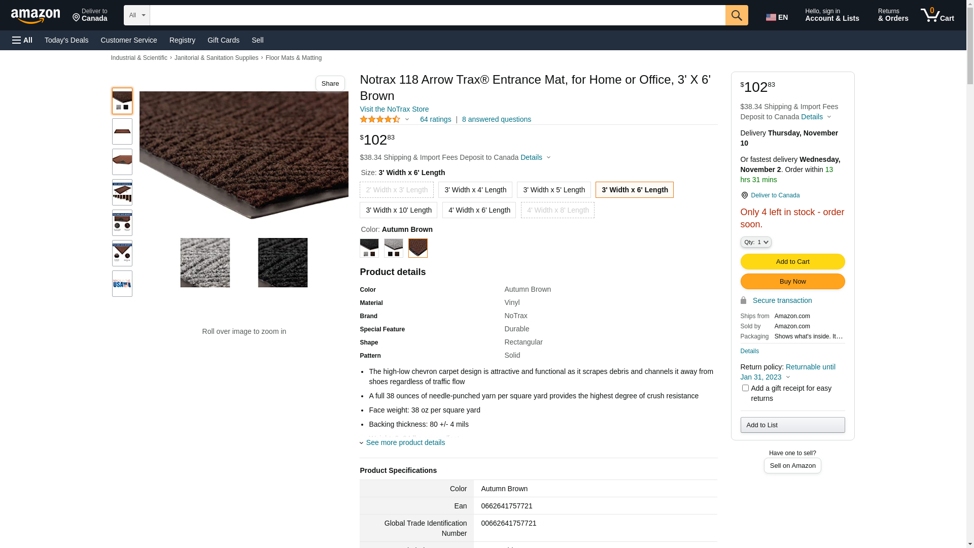 Notrax 118 Arrow Trax® Entrance Mat, for Home or Office, 3' X 6' Brown