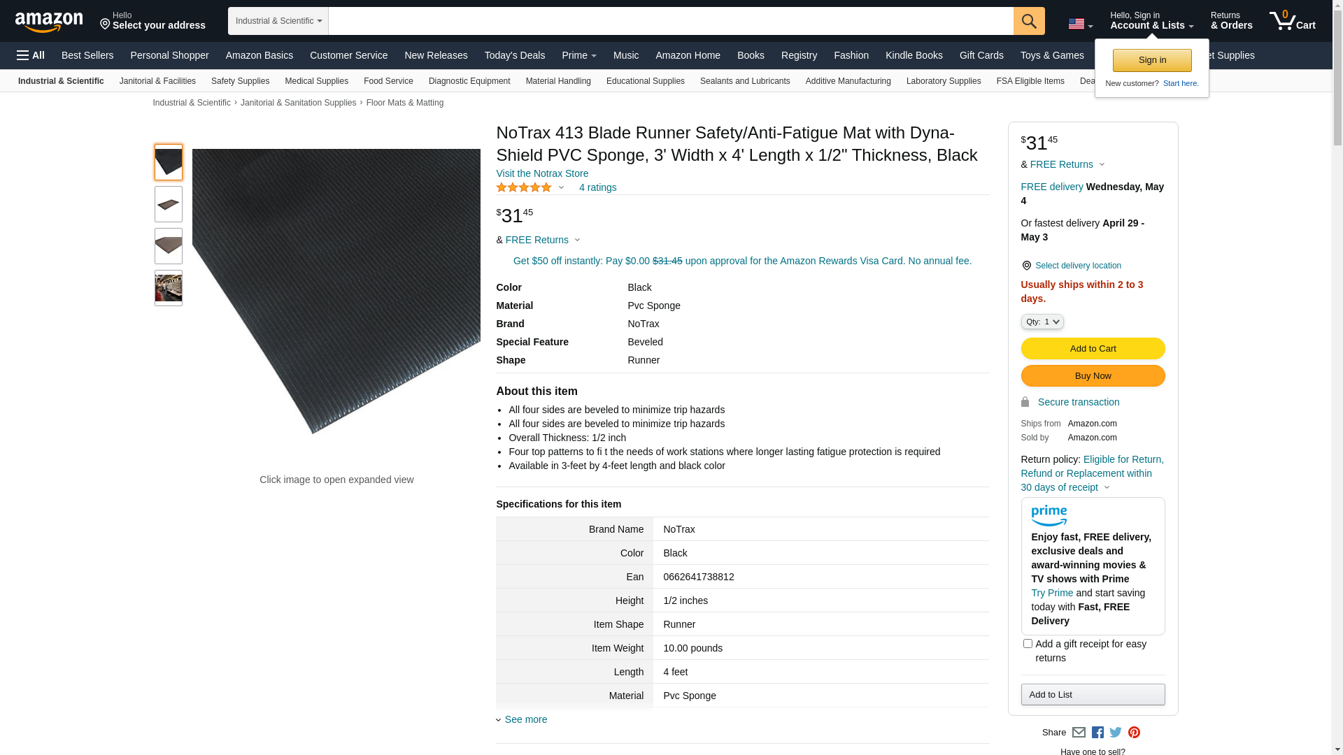 NoTrax 413 Blade Runner Safety/Anti-Fatigue Mat with Dyna-Shield PVC Sponge, 3' Width x 4' Length x 1/2" Thickness, Black