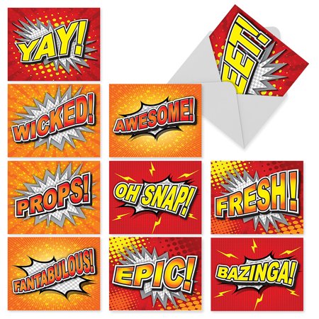 10 All-Occasion Note Cards (with Envelopes), Assorted ‘Word Bursts’ Blank Greeting Cards Featuring Comic Book Exclamations, Stationery for Birthdays, Congratulations, Thank You (4” x 5 ¼”) #M2033