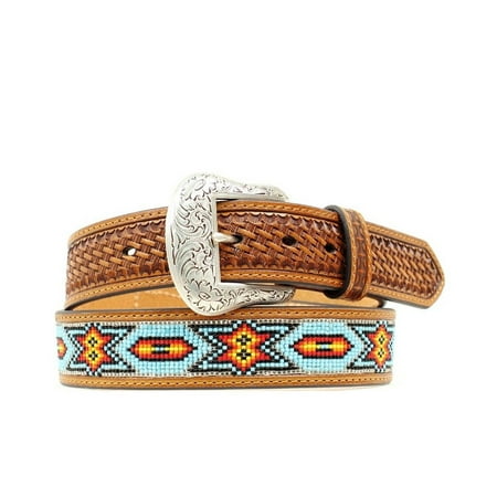 Mens Nocona Belt: Mens Nocona Western Belt. Hey cowboy! For the rodeo or the ranch. This mens Ariat belt from M&F Western is sure to be a hit. Constructed with superior quality from genuine leather for years of wear. Featuring basket weave tooling throughout, single edge stitching, multi colored beaded inlay and a horseshoe silver buckle with floral detail. 1.5 inches. N2412808 Mens Belts: as a guide, generally, if you wear size 34 jeans, your belt is size 36. Braided Belts: finished length approximately 46 and fits to size 42; or, finished length approximately 52 and fits to size 48.