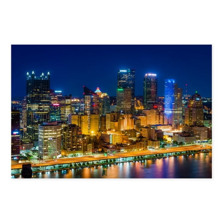 <ul> <li>Select from available sizes</li> <li>For indoor use</li> <li>Features a skyline view of Pittsburgh at night</li> <li>Metal construction</li> <li>0.5-in. float mounting block for easy hanging</li> <li>Artwork by Jon Bilous</li> </ul>