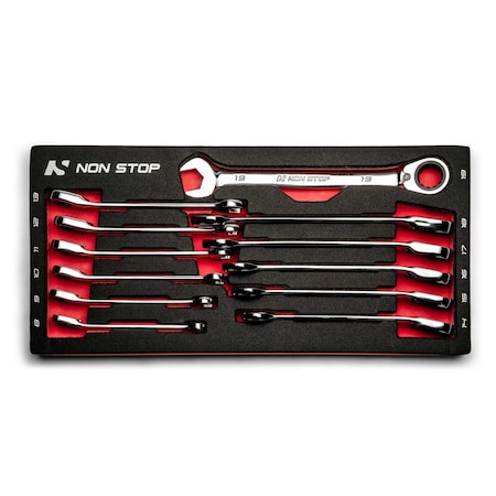 - 12-piece ultrafine reversible ratcheting combination wrench set: 8, 9, 10, 11, 12, 13, 14, 15, 16, 17, 18, 19 mm in a high-quality reinforced EVA tray