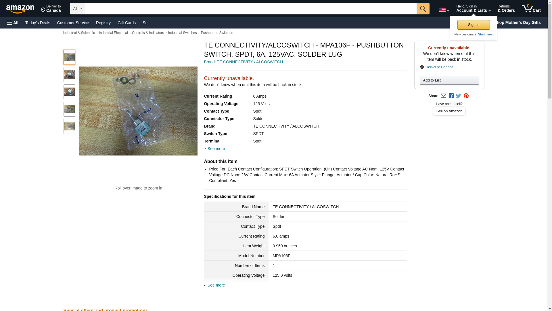 TE CONNECTIVITY/ALCOSWITCH MPA106F PUSHBUTTON Switch, SPDT, 6A, 125VAC, Solder Lug