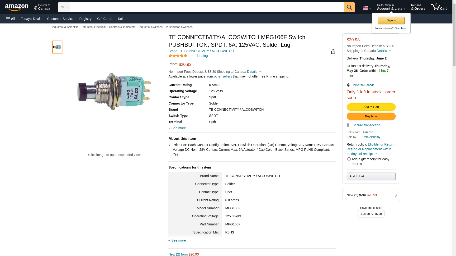 TE CONNECTIVITY/ALCOSWITCH MPG106F Switch, PUSHBUTTON, SPDT, 6A, 125VAC, Solder Lug