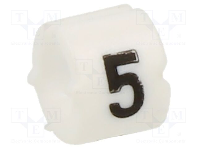| Feature | <b>Price For:</b> Pack of 10<b>Order Unit:</b> Each\xa01 <b>Cable Diameter Max:</b>: 3.5 <b>Cable Diameter Min:</b>: 2.6 <b>Legend:</b>: 5 <b>Legend Color:</b>: Black <b>Marker Color:</b>: White <b>Marker Dimensions:</b>: - <b>Marker Material:</b>: PVC (Polyvinylchloride) <b>SVHC:</b>: To Be Advised |