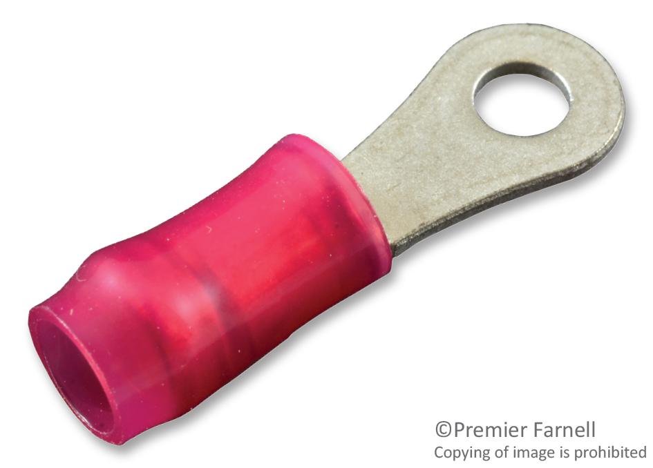 TERMINAL, RING TONGUE, #4, CRIMP, RED; Stud Size - Metric:M2.5; Stud Size - Imperial:#4; Wire Size AWG Max:16AWG; Conductor Area CSA:1.3mm²; Product Range:PIDG Series; Insulator Colour:Red; Insulator Material:Nylon (Polyamide) RoHS Compliant: Yes