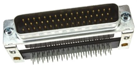 EU RoHS: Compliant ECCN (US): EAR99 Part Status: Active HTS: 8536.69.40.40 Type: D-Subminiature Gender: M Number of Contacts: 50 Number of Terminals: 50 Number of Ports: 1 Number of Rows: 3 Termination Method: Solder Terminal Pitch (mm): 1.38 Body Orientation: Right Angle Contact Gender: M Maximum Current Rating (A): 6/Contact Maximum Voltage Rating: 250VAC|250VDC Insulation Resistance (MOhm): 5000 Maximum Contact Resistance (mOhm): 15 Minimum Operating Temperature (°C): -55 Maximum Operating Temperature (°C): 105 Mating Cycle (Cycles): 500 Shell Material: Carbon Steel Shell Plating: Tin Over Copper Shell Size: 5 Less Contact: No Packaging: Tube Product Length (mm): 66.92 Product Depth (mm): 29.18 Product Height (mm): 15.36 Housing Color: Black Contact Plating Thickness: (Flash/(0.762/1.27)um)|(0.762/1.27)um Contact Plating: Gold Over Palladium Nickel Over Nickel|Gold Over Nickel Mounting: Through Hole Contact Material: Brass