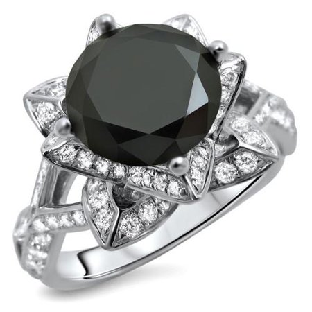 <li>Ring features one, round cut, central black diamond for a distinctive look</li> <li>Center diamond weighs 2 1/6 carats</li> <li>Prong setting ensures diamonds are safely secured on band</li>