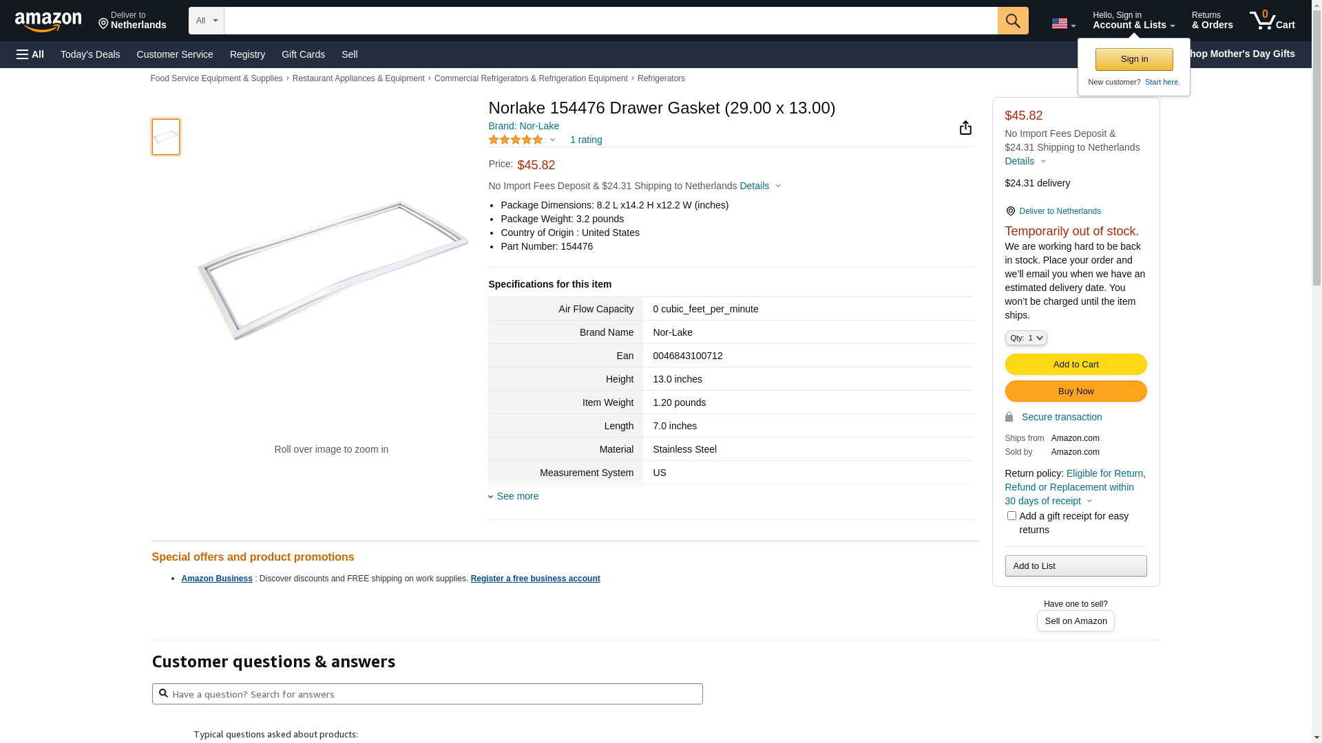 ![]() midwestapplianceparts.com | 154476-NOR-P | 1 | Current Unavailable - No ETA Available | 1 | 1 @ $69.48 |