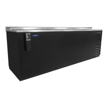 Refrigerated bottle cooler; 95 9/16 in (W) x 26 1/2 in (D) x 33 3/8 in (H); Black vinyl coated steel cabinet exterior front, sides, back & 7 adjustable product dividers; Stainless steel top with 3 easy glide sliding lids; Interior walls and floor are galvanized with floor drain; Foamed-in-place 1 1/2 in CFC-free polyurethane insulation; Self-contained forced air refrigeration system with a temperature range of 33°F to 38°F; Automatic condensate evaporator and defrost; Multiple evaporator fan motors; Adjustable temperature control; Integrated glass rail on rear top and plastic breaker strips around door openings to limit formation of any condensation; Removable cap catcher with bottle opener; 31.5 cu/ft capacity; Holds 1408 12 oz cans or 672 12 oz bottles; 115/60/1ph, 1/3HP, 6.3A; Includes cord and plug (NEMA 5-15P); 1 year parts & labor warranty; 5 year compressor warranty; ETL Safety & Sanitation listed