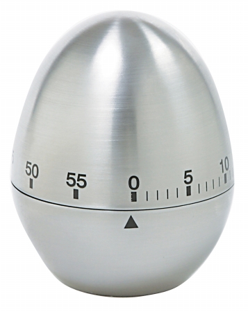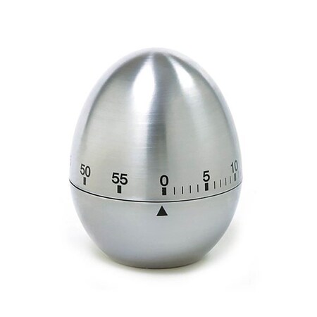 Egg timer. Versatile for all your kitchen needs. Times from 1 minute to 60 minutes with a long ring. You can also use it in your exercise room, garden or around the block. Flat, stable base. Solid and heavy duty. Brushed stainless steel. 3". Length: 2.5. Width: 2.5. Height: 4.3