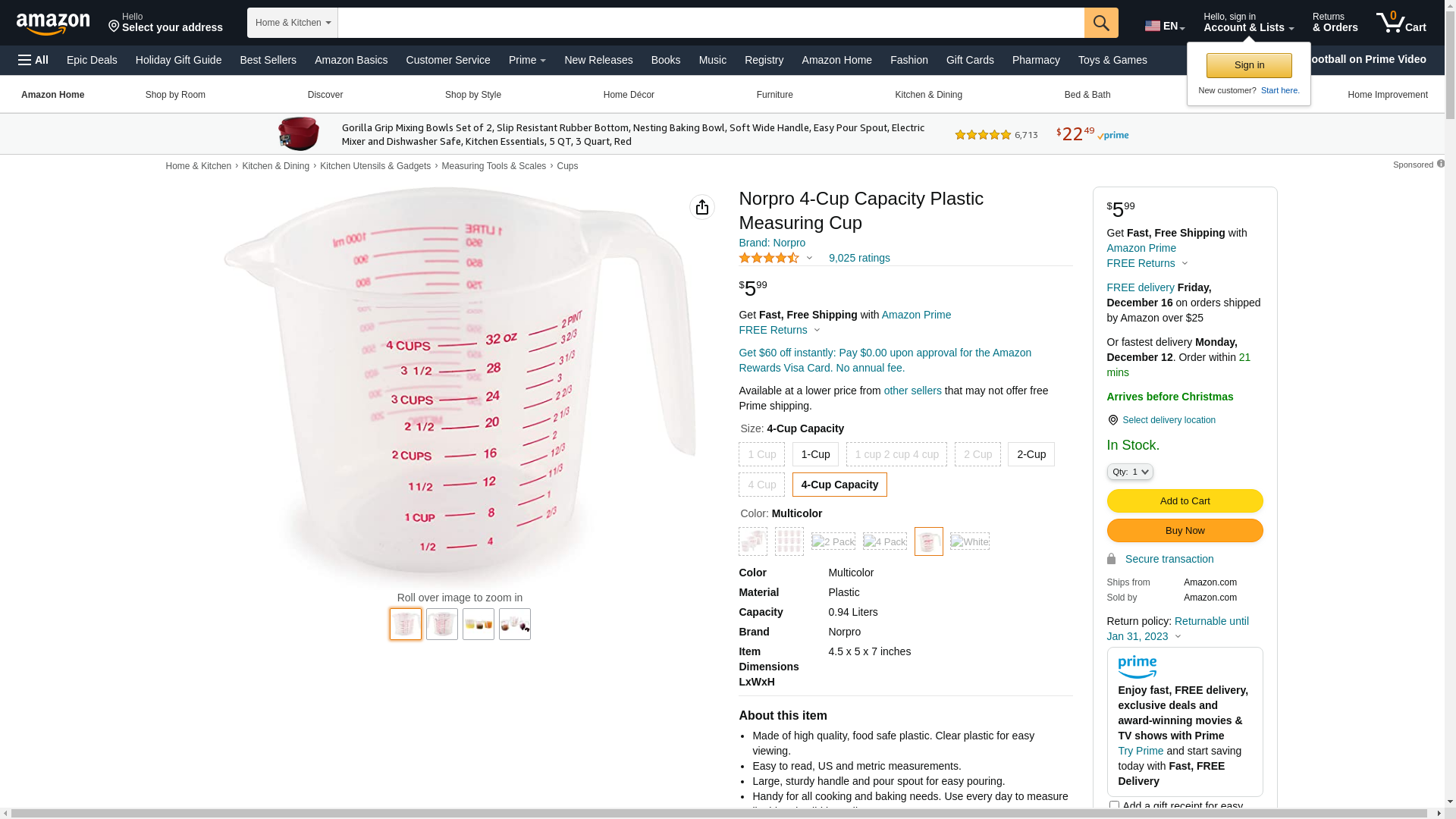 Norpro 4-Cup Capacity Plastic Measuring Cup, Multicolor