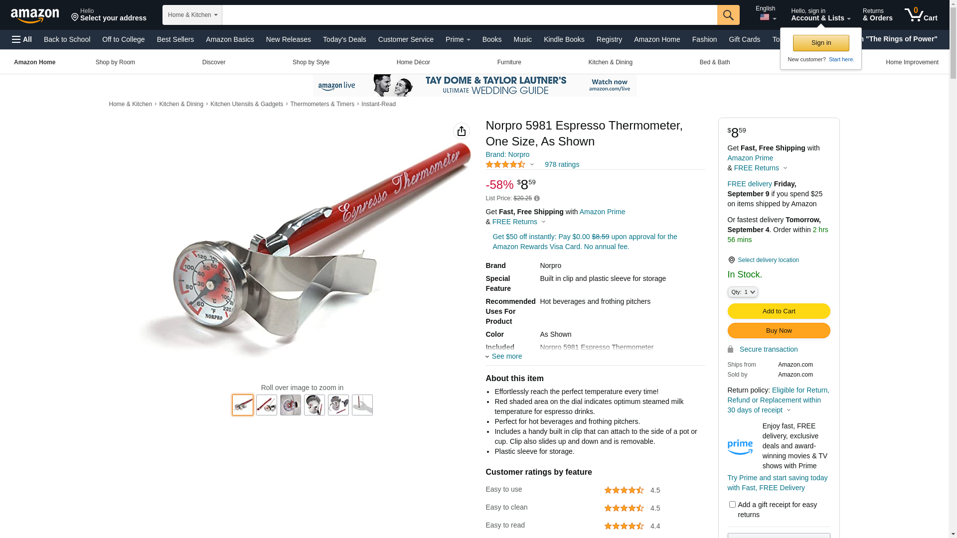Indicates optimum steamed milk temperature for espresso drinks. Measures 6-inch /15cm long. Includes a clip with sleeve.