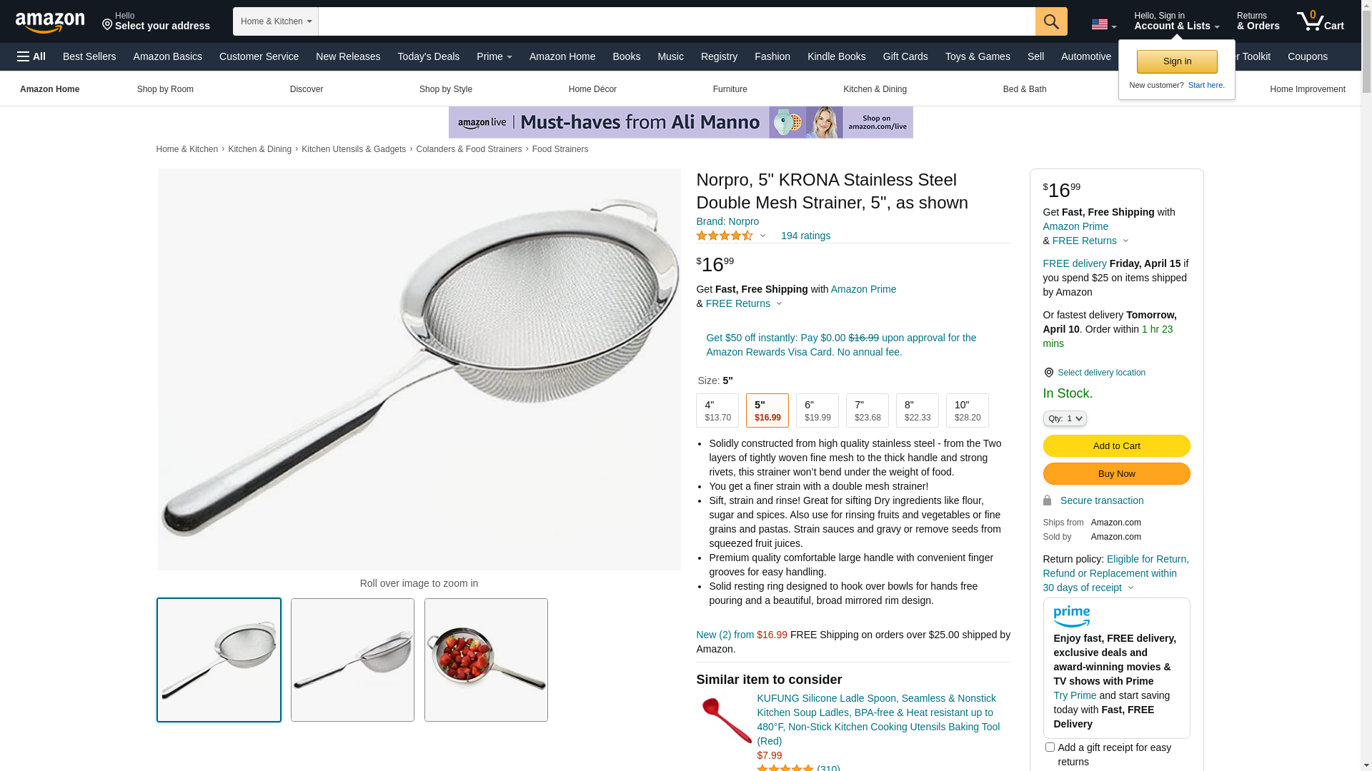 Norpro, 5" KRONA Stainless Steel Double Mesh Strainer, 5", as shown