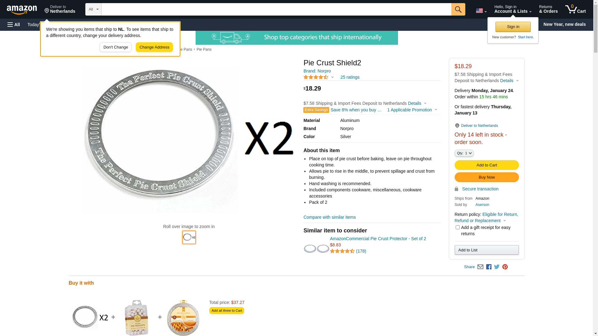 Place on top of pie crust before baking, leave on pie throughout cooking time. Reusable shields can be used on frozen and homemade pies. Allows pie to rise in the middle, to prevent spillage and crust from burning. Fits 9.5" to 10" pies. Material: Aluminum Fits Pie Pan Size: 9.5 In. to 10 In.