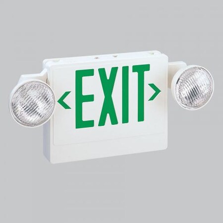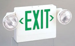 Combination dual head emergency/exit fixture with green letters and white housing.