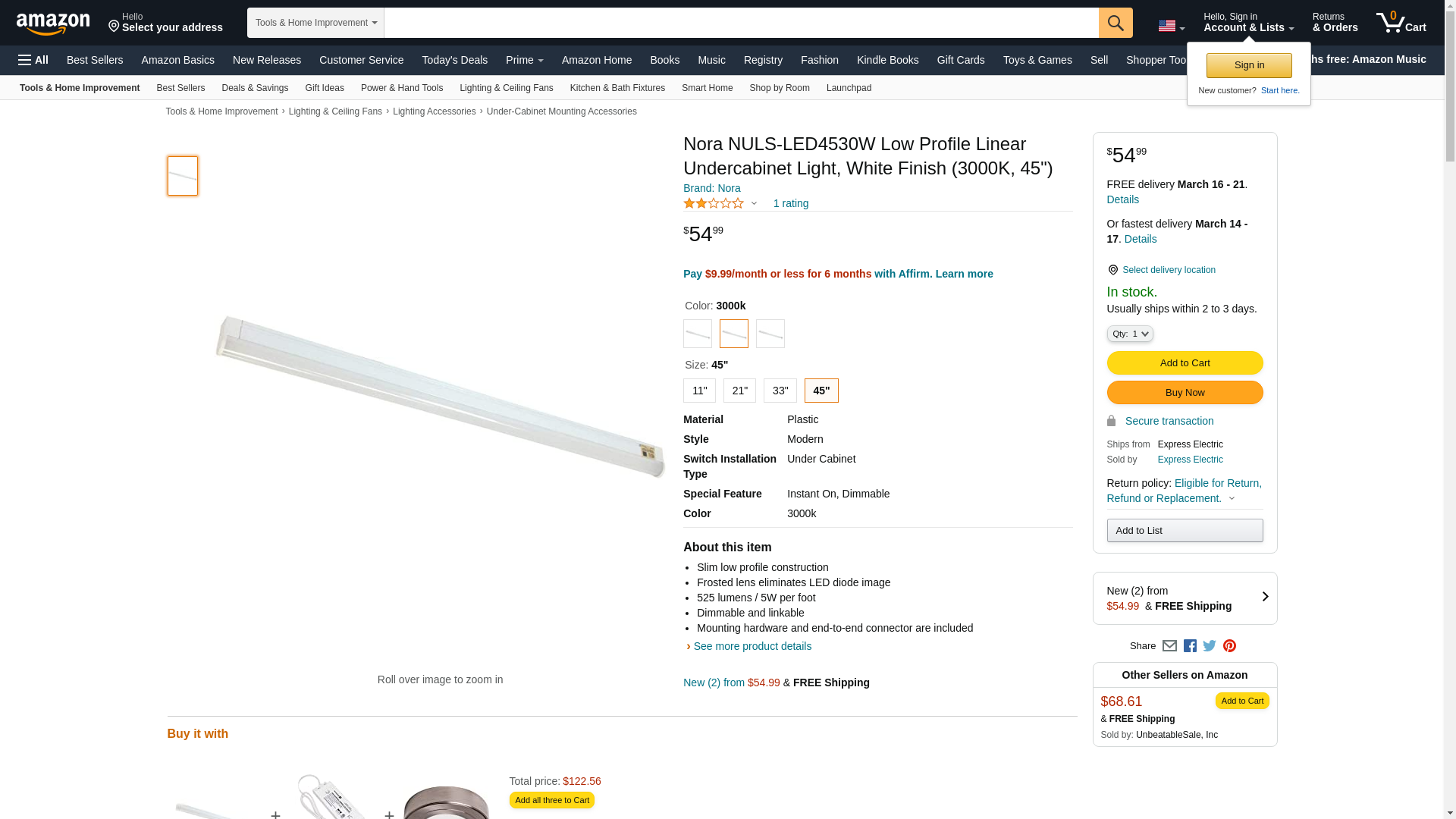 Nora NULS-LED4530W Low Profile Linear Undercabinet Light, White Finish (3000K, 45")