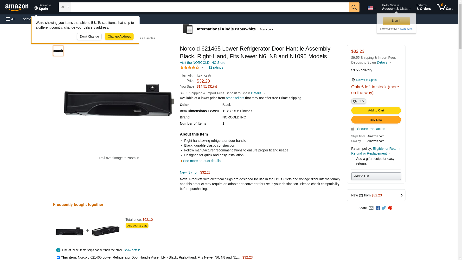 Norcold 621465 Lower Refrigerator Door Handle Assembly - Black, Right-Hand, Fits Newer N6, N8 and N1095 Models