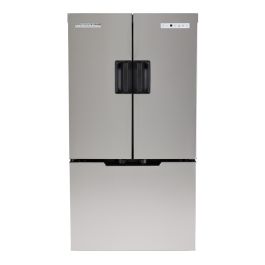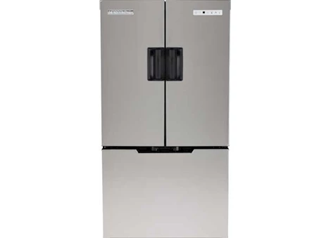 Dual Compartment 3 Door Refrigerator With Freezer; Permanent; 15 Cubic Foot; 32-3/4 Inch Width x 24 Inch Depth x 63-5/16 Inch Height; 6.5 Amp Draw At 12 Volt DC; Direct Current Only; Without Ice Maker; LED Temperature Control Panel; With Automatic Cabinet Light Shut Off; Black Frame; Stainless Steel Wrapped Edge French Doors And Bottom Drawer; With Night Mode For Compressor Operation/ Dual Crisper Drawers/ Adjustable Glass Shelving/ Clear Door Bins/ Integrated Ergonomic Door And Travel Latches