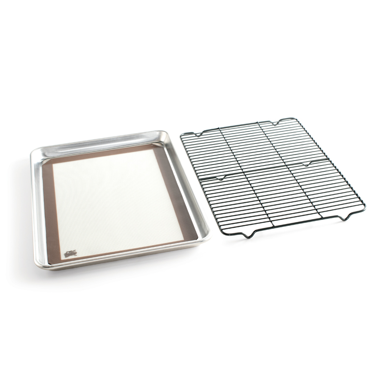 Your favorite recipe cookies are sure to come out perfectly when you use the 3-Piece Cookie Baking Set! This set includes an all natural aluminum half sheet pan, a large cooling rack, and a silicone mat, making this a truly versatile set. Bake cookies or croissants on the baking sheet with the silicone mat; cool them on the rack to prevent moisture from collecting on the bottom; use the cooling rack as a breading station and then bake oven-fried chicken on the baking sheet with mat; use the baking sheet alone to make a hearty sheet pan supper; the options are unlimited!